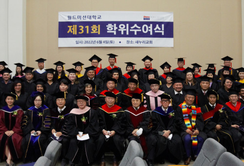 졸업생들과 학교 관계자들이 학위수여식을 마치고 기념사진을 찍고 있다.LA한인타운에 있는 월드미션대학교가 새로운 기독교 전문 사역자 99명을 배출했다.월드미션대학교는 지난 4일 남가주새누리교회에서 31회 학위수여식을 갖고 대학 졸업생 48명, 대학원 졸업생 51명 등 전체 99명의 새 기독교 전문 인재들을 졸업시켰다.월드미션대학교 임성진 총장은 인사말을 통해 “지난 2년 동안 많은 것이 바뀌었다”며 “소통방법과 목회 현장이 바뀐 만큼 사역의 방법도 바뀌어야 한다”지적했다. 또 “믿음의 선한 싸움을 싸워 세상 사람들에게 칭찬받는 사역자가 되어야 한다”고 강조했다.이번 졸업식은 2년 여 만에 대면 졸업식으로 진행됐다. 미국은 물론 해외에서 공부한 졸업생들이 참석해 진행됐다.