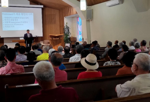 유튜브 등을 통해 미국과 국제사회 바로알기 개인방송를 진행해 온 마이클 심 박사 강연회가 지난 11일 풀러튼 참사랑교회에서 개최됐다. 이번 강연회는 200여명의 한인들이 참석한 가운데 미국의 건국 배경과 미국이 강대국으로 성장한 과정 등을 확인했다. 마이클 심 박사는 매사추세츠 대학에서 국제경제학 박사학위를 받은 것으로 알려졌다. 현재 매사추세츠 로웰대학 경제학과 교수로 활동하고 있다. 마이클 심 박사(강대상 위)가 강연하고 있다.