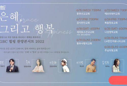 GBC힐링찬양콘서트 포스터.미주복음방송(GBC, 사장 이영선 목사)이 팬데믹과 함께 경제적인 어려움을 지나고 있는 한인 기독교인들을 위로하기 위한 찬양콘서트를 진행한다.GBC 지난 15일을 시작으로 26일까지 약 2주 동안 LA지역을 비롯해 오렌지카운티 지역 9개 한인 교회를 돌며 GBC힐링찬양콘서트를 개최하고 있다. 이번 찬양콘서트는 코로나19로 인한 팬데믹 기간 대면예배가 어려운 상황에 영적으로 지친 기독교인들에게 영성과 새로운 희망을 불러일으키기 위해 마련됐다. 특히 대면예배의 회복이 어렵다는 데이터들이 발표되는 가운데 찬양을 통해 모임의 필요성을 인식 시키기다는 계획이다.이번 GBC힐링찬양콘서트는 지난해 큰 은혜를 끼쳤던 찬양곡, ‘은혜’와 ‘행복’을 작사, 작곡한 손경민 목사와 ‘천번을 불러도’로 널리 알려진 찬양 사역자 주리를 비롯해 윤화, 이기명, 김정희 등의 영성과 실력을 갖춘 정상급 찬양 사역자들이 참여한다.GBC는 “찬양과 예배를 사모하는 모든 그리스도인들이 모여 하나님의 은혜를 기억하고 함께 찬양하며 치유와 회복을 경험하기 위해 마련된 만큼 모든 공연은 무료다”라고 밝혔다.한편 이번 GBC힐링찬양콘서트는 지난 15일 충현선교교회(담임목사 민종기)에서 시작돼 17일 감사한인교회(담임목사  구봉주)와 18일 중부교회협의회 주관으로 세리토스선교교회(담임목사 방상용), 19일 동부사랑의교회(담임목사 우영화) 등에서 진행됐다.오는 22일에는 에브리데이교회 (담임목사 최홍주, 17037 Devonshire St, Northridge), 24일 복음장로교회(담임목사 이광형,  1751 W La Habra Blvd, La Habra), 25일 나성영락교회(담임목사 박은성, 1721 N Broadway, Los Angeles) 등에서 개최된다. 마지막 날인 26일에는 오전 11시 50분 LW한인커뮤니티교회(담임목사 용장영, 14000 Church Pl, Seal Beach)에서, 오후 6시 주님의빛교회(담임목사 주혁로, 5271 Lincoln Ave, Cypress)에서 두 차례 진행된다.2022 GBC힐링찬양콘서트에 참가하는 작곡가 손경민 목사는 ‘은혜’, ‘행복’, ‘감사’, ‘주의 은혜라’, ‘청년의 기도’ 등 한인 기독교인들이 애창하는 많은 CCM곡을 만들었다. 한국 침례신학대학교 교회음악대학원 전 겸임교수, 대전과학기술대학교 실용음악과 전 겸임교수 등을 역임했다. M.net ‘너의 목소리가 보여’ 시즌 5, 6 음악감독 및 편곡가로도 활동한 바 있으며 TV조선 미스트롯 시즌 1 음악편곡 및 음악조감독 등 다수의 음악방송의 책임자로 활동했다.찬양사역자 주리는 ‘나의 예수님’, ‘갚을 수 없는 사랑’, ‘천 번을 불러도’, ‘부르심’, ‘치유의 노래’, ‘사랑이 사라진 이곳에’ 등으로 유명한 찬양 가수다. 2008년 솔로 앨범 ‘갚을 수 없는 사랑’ 으로 데뷔해 2013년 정규앨범 3집을 발행했다. 찬양사역자 이윤화는 지난 2000년 MBC 강변가요제에서 동상을 수상하면서 음악활동을 시작했다. 이후 MBC 시트콤 뉴 논스톱 ost를 제작했으며 그룹 신화 8집 앨범 제작에 참여했다. 대표적인 찬양곡으로 ‘내려놓음’, ‘이땅은’, ‘은혜’ 등이 있다.섹소폰 연주자 이기명 전도사는 바이브, 휘성, 박지헌(V.O.S)등 세션 연주자로 참가했다. 커피소년, 미남오빠 등 다수의 앨범에서 세션작업을 했다. 이기명 1집 ‘I Surrender All’ 발간했다.피아노 연주자인 김정희 사모는 ‘은혜’, ‘행복’, ‘감사’ 등 다수의 찬양곡에서 피아노를 연주했다. 대전과학기술대학교 실용음악과 외부강사로 활동했다. TV조선 ‘미스트롯’ 건반편곡 및 다수의 방송음악 세션 연주자로 활동했으며 솔로음반 1집 ‘평안의 기도’를 발매했다.