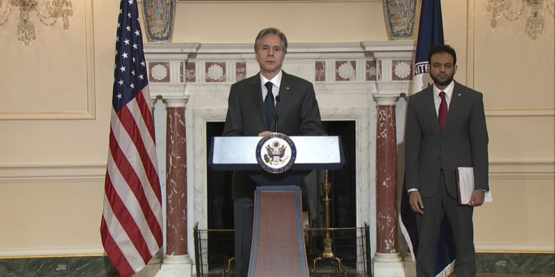 안토니 블링컨 국무장관(왼쪽)이 라샤드 후세인 국제종교자유대사와 함께 지난 2일 연방 국무부에서 ‘2021 국제종교자유보고서’를 발표하고 있다. 국무부 유튜브 동영상 캡쳐.