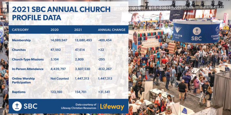 크리스차너티투데이는 지난 4월 발표된 2021년 남침례교 연례교회현황(Annual Church Profile)을 인용해 코로나19 팬데믹 막바지로 들어서는 지난 2021년 전체 교인수가 1370만 명으로 40여 년 만에 최저치를 기록했다고 전했다.