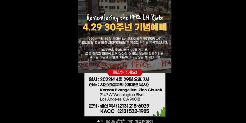30년 전에 일어난 LA 4.29폭동에 대한 원인을 살피고 화합과 번영을 다지는 기념예배가 오는 29일 오후 7시 시온성결교회(담임 이대연 목사, 2149 W Washington Blvd. LA. CA)에서 개최된다.
