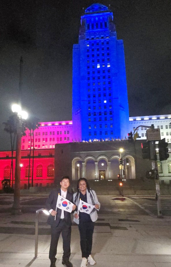 8월 15일 저녁, 로스앤젤레스 시청 건물이 붉은색·흰색·파란색 불빛으로 수놓아졌다. 이는 한국의 광복 80주년을 기념하는 특별 조명 행사로, 헤더 헛(Heather Hutt) LA 시의원이 주최했다. 샘신 회장을 비롯한 교협 임원들이 초청받아 함께 기도하고 교민들과 교제를 나누며, LA 한인 사회의 뿌리와 정체성을 다시금 확인하는 시간이 되었다.