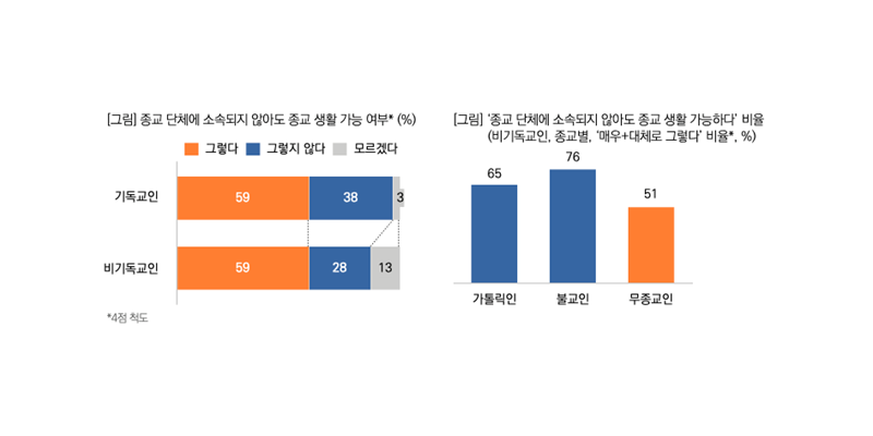 종교 단체에 소속하지 않아도 종교 생활이 가능할까? 기독교인과 비기독교인 모두 10명 중 6명꼴로 ‘그렇다’고 응답했다. 한국 목회데이터연구소의 최근 발표에 의하면 이는 기독교인의 제도화된 교회에 대한 의존도가 비기독교인 수준과 비슷해졌음을 의미하며, 탈종교적 인식이 확산되고 있음을 보여주는 지표로 주목된다.
